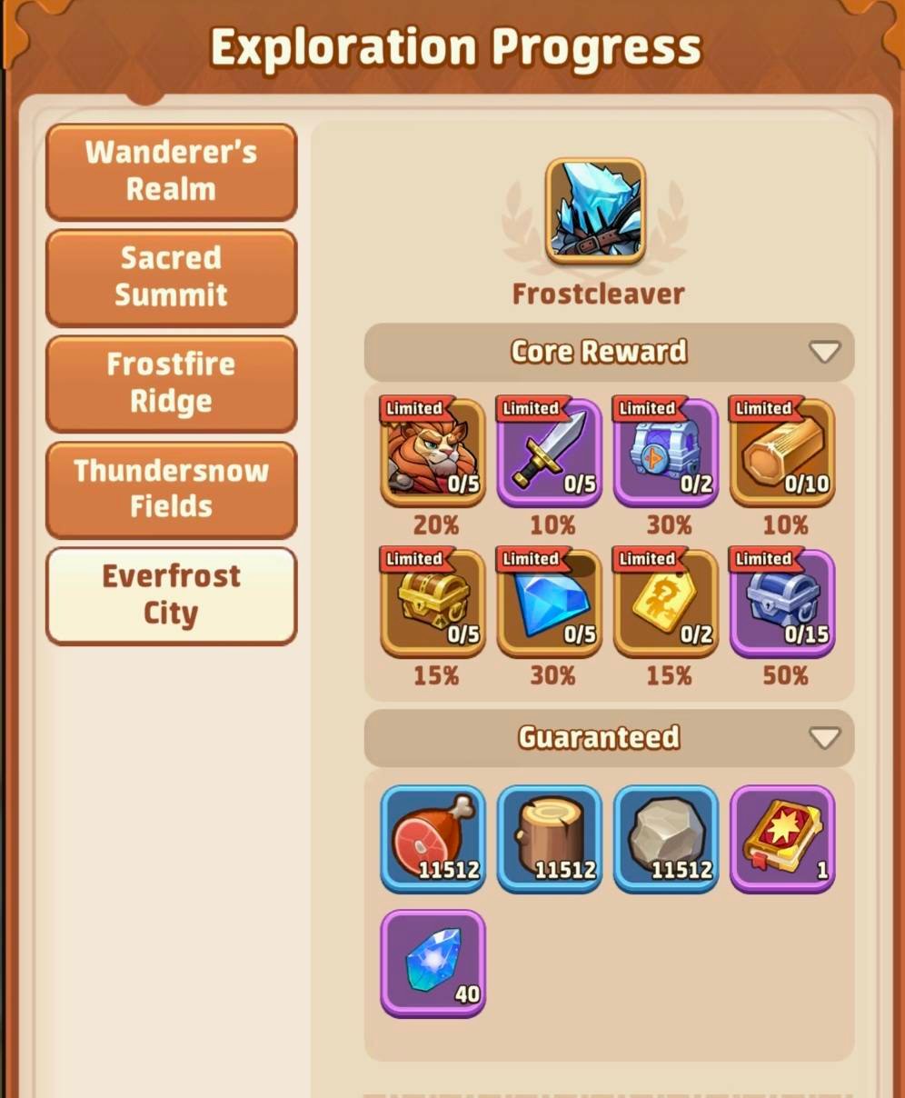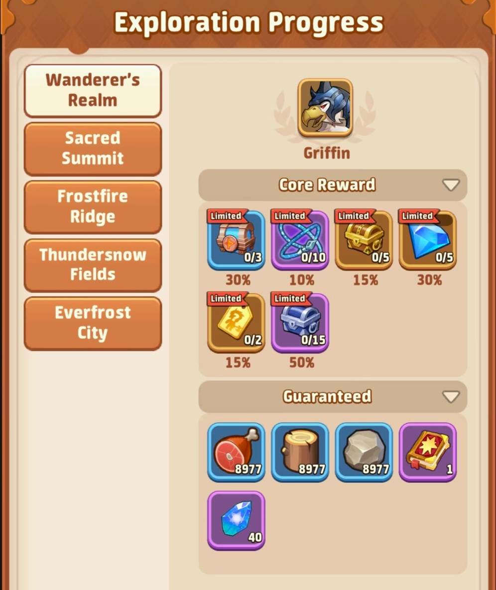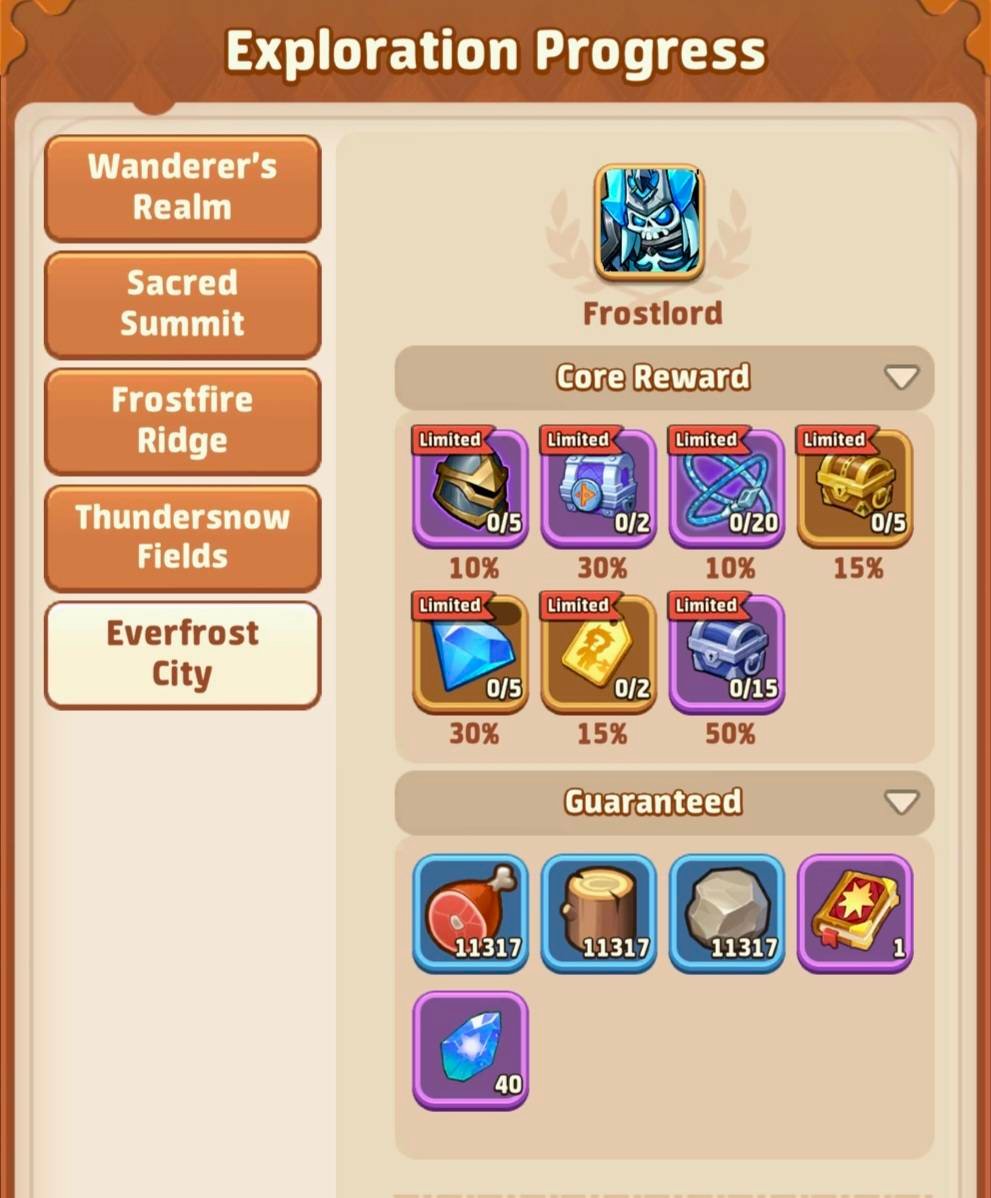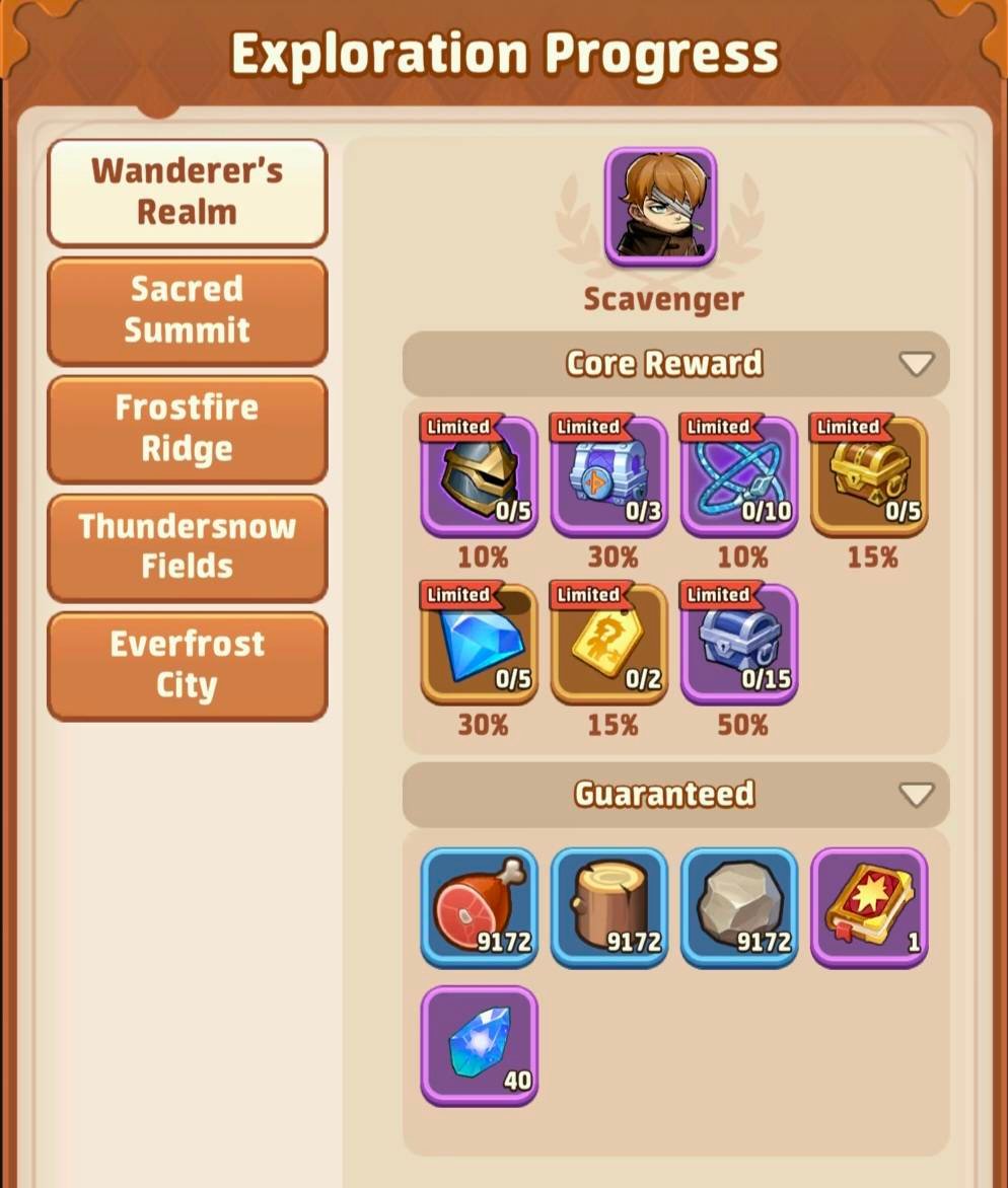 - Then you’ll have the details of each exploration zone, the number of portals, chests, bosses and regions to find and complete your progress bar to 100% and win the 2 rewards. Scroll down to see the list of all bosses and all the loots you can get on them and their % rates.